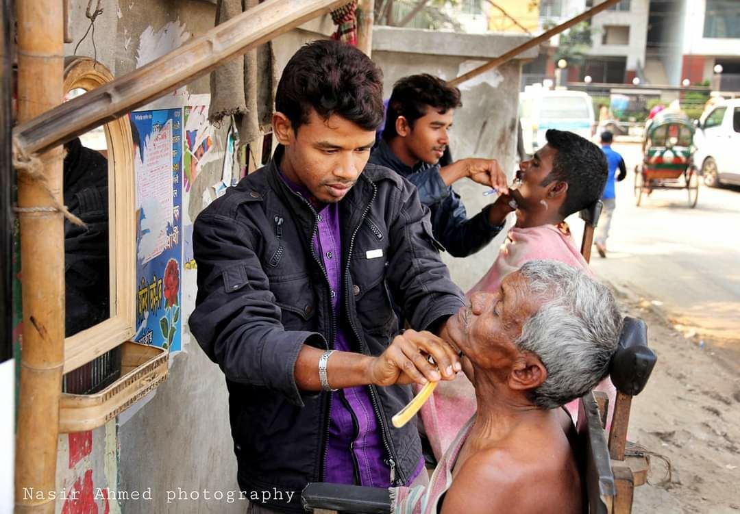 | গ্রামের বাজারে চুল কাটার দৃশ্য |