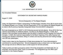 মার্কিন যুক্তরাষ্ট্রের ট্রাম্প প্রশাসন বালোচিস্তানের স্বাধীনতাকামী সশস্ত্র সংগঠন বালোচ লিবারেশন আর্মি (BLA)–কে আনুষ্ঠানিকভাবে সন্ত্রাসী ও জঙ্গি সংগঠন হিসেবে ঘোষণা করেছে। সোমবার যুক্তরাষ্ট্রের পররাষ্ট্র সচিব মার্কো রুবিও এক বিবৃতিতে এ কথা জানান। এ ঘোষণার ফলে সংগঠনটির সম্পদ জব্দ, সদস্যদের ওপর ভ্রমণ নিষেধাজ্ঞা এবং আন্তর্জাতিকভাবে নজরদারি জোরদার হবে।